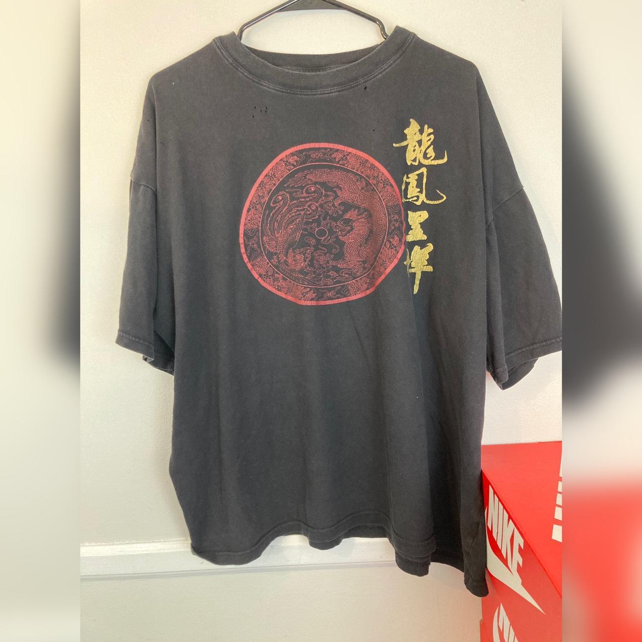-black t-shirt with gold lettering and a red graphic on the front of a peacock fighting a dragon