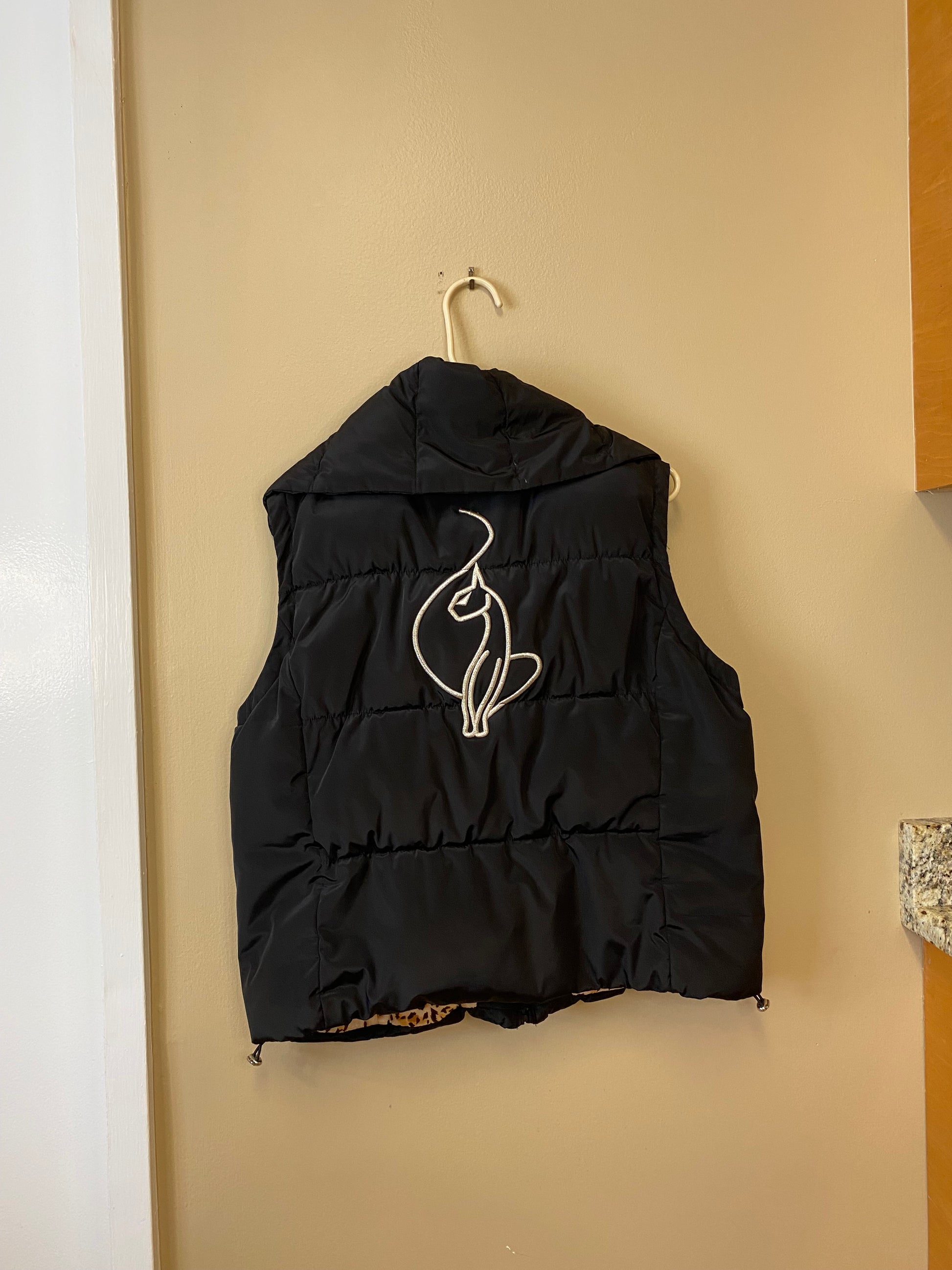-black puffer vest with leopard print lining, silver buttons, and silver logo embroidered on back