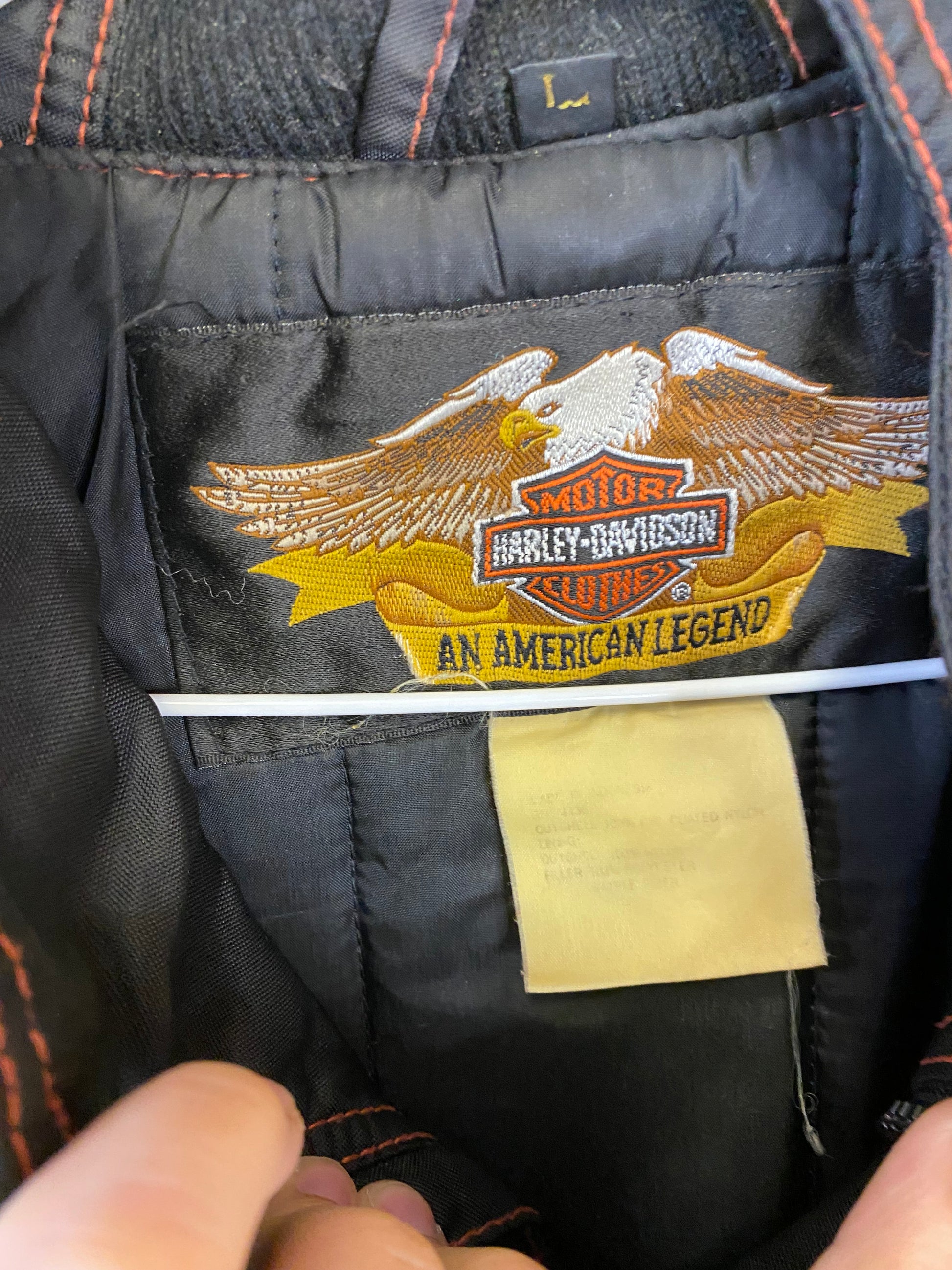 -black orange threading with Harley Davidson logo embroidered on back and patch on shoulder