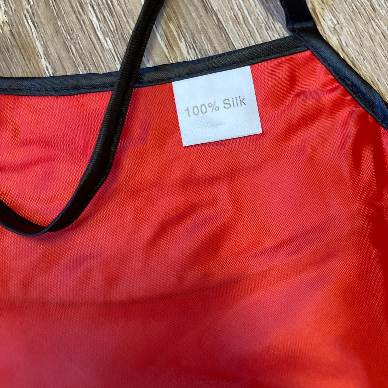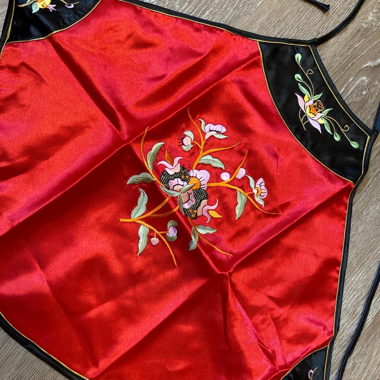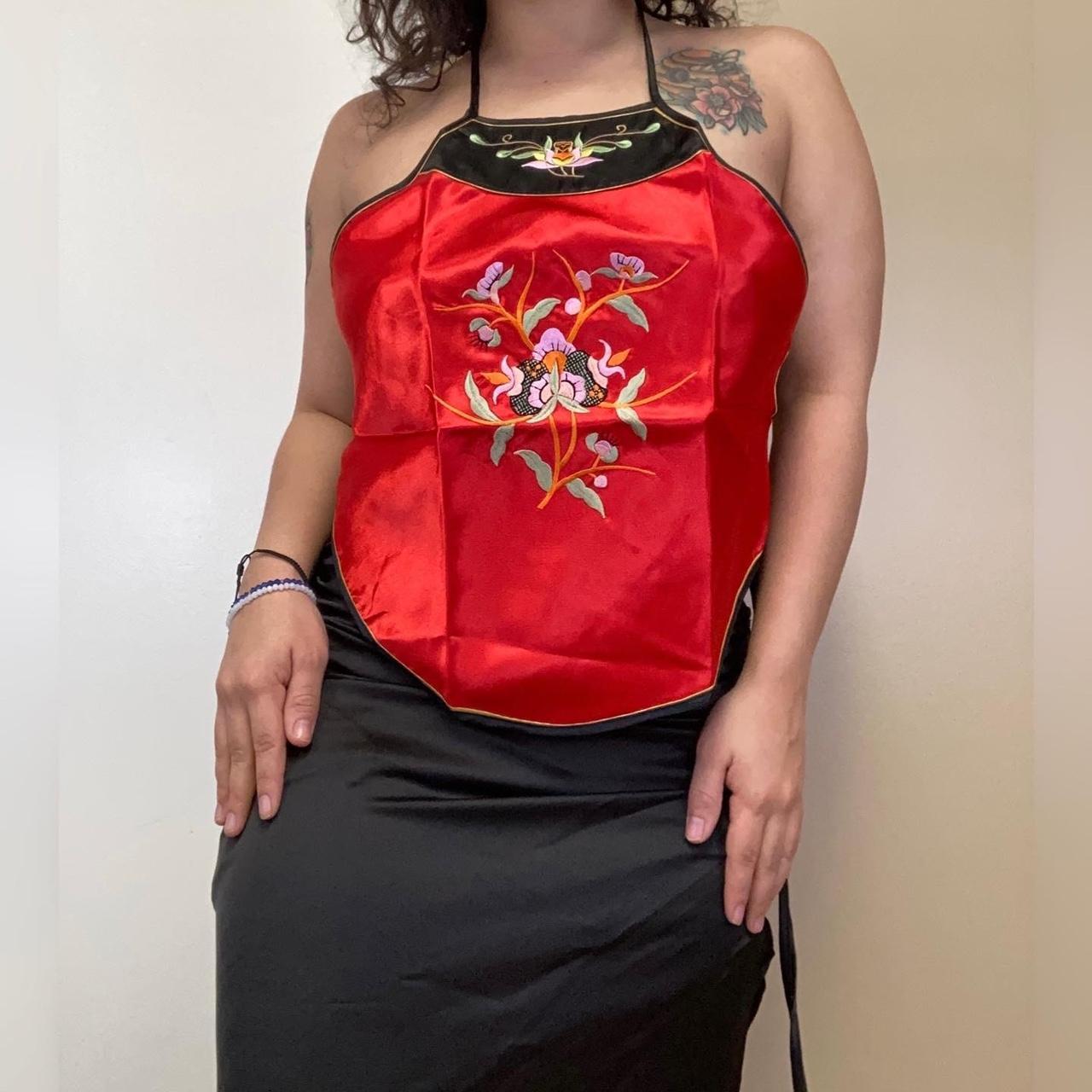 -red halter top with a pink flower embroidered on the front and black strings around back for adjusting