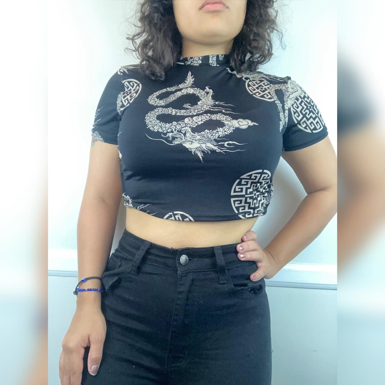 -Black Crop Top with dragon pattern all over and back cut out shirt has string in back to make shirt more form fitting